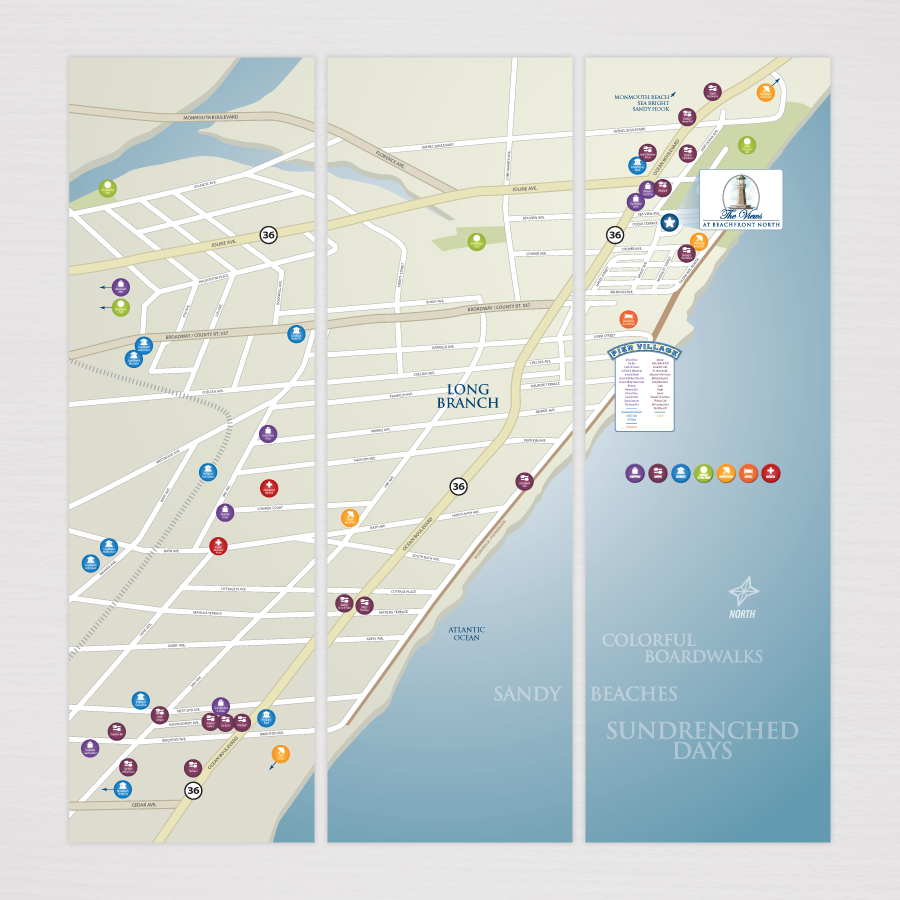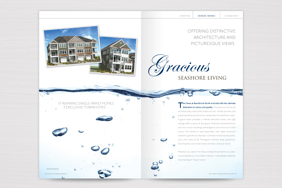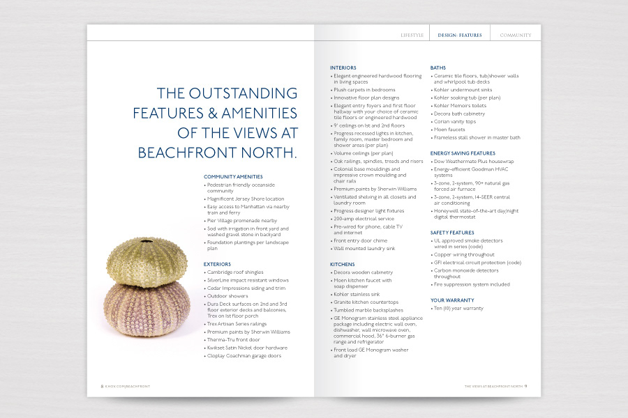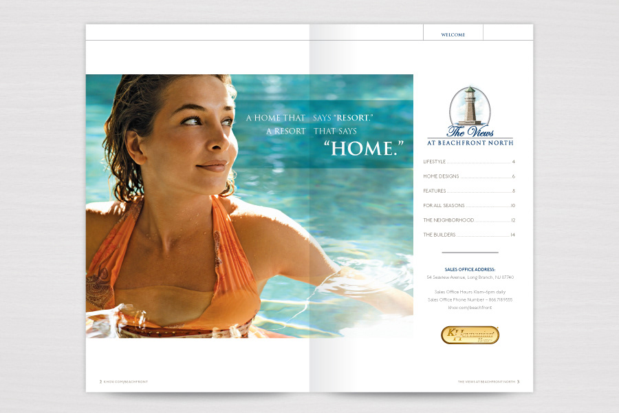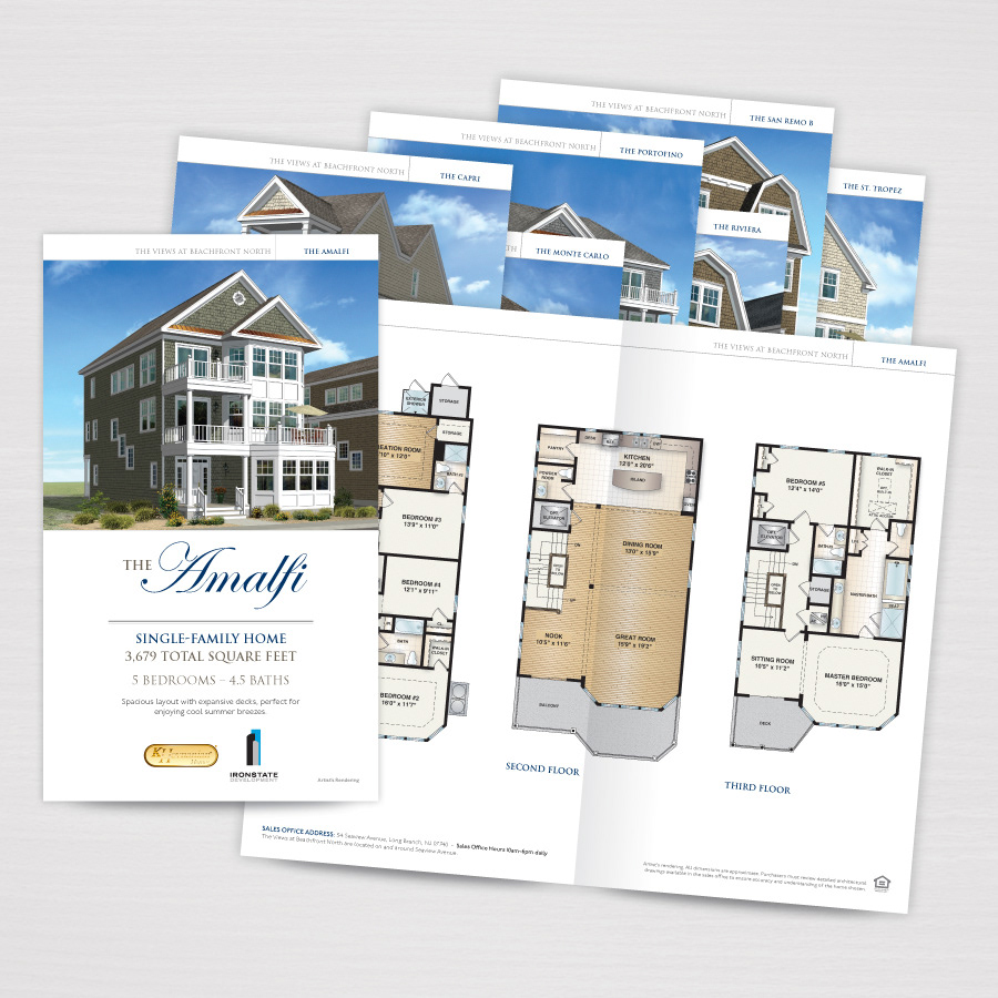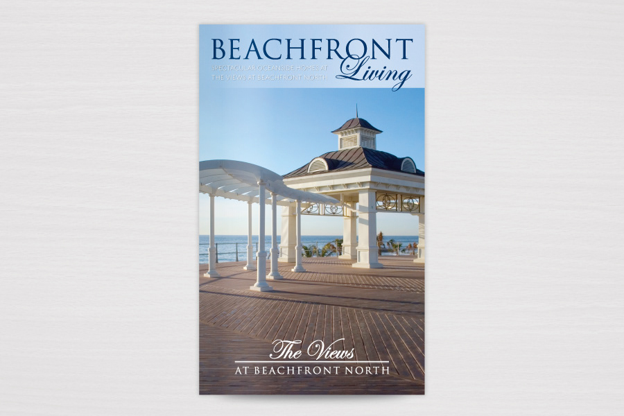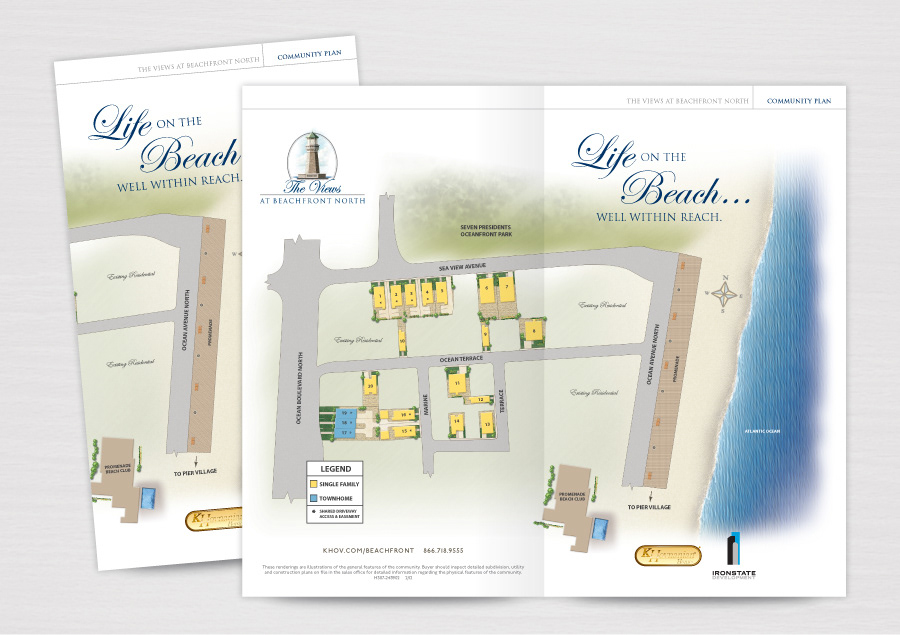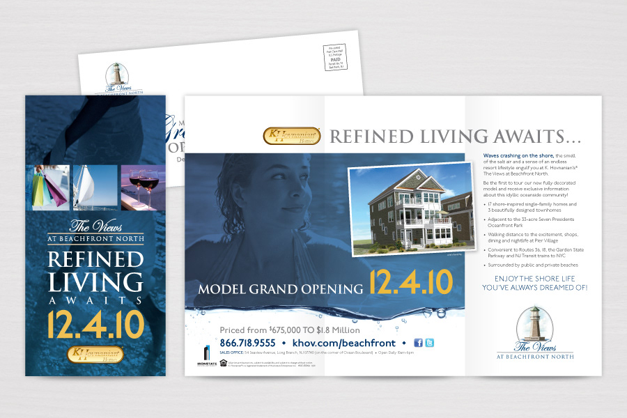 K. Hovnanian's® The Views at Beachfront North is an award-winning, oceanside community in Long Branch, New Jersey, featuring 21 custom homes. This project included a 16-page brochure with pocket, floor and site plan inserts, sales center map triptych, and a direct mail piece.