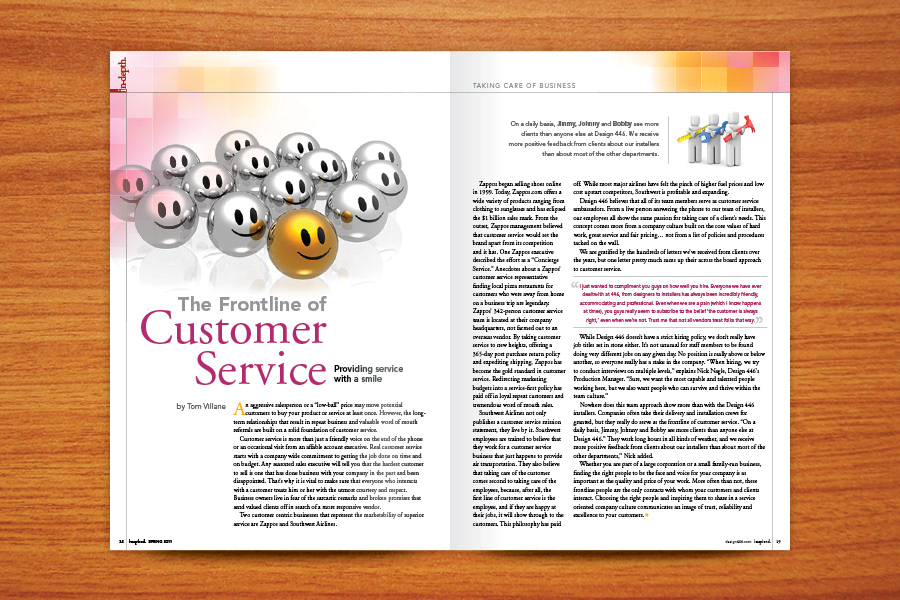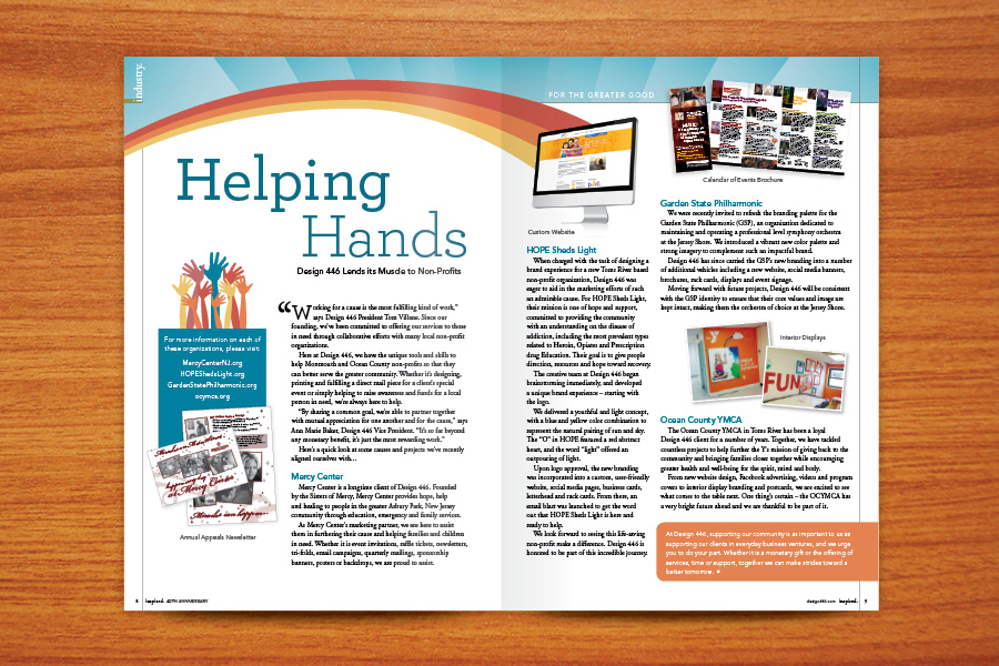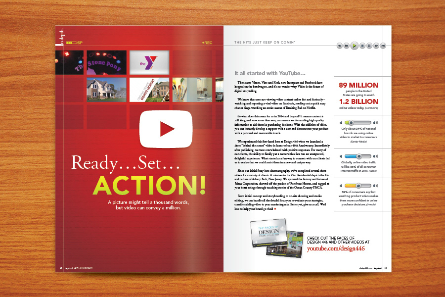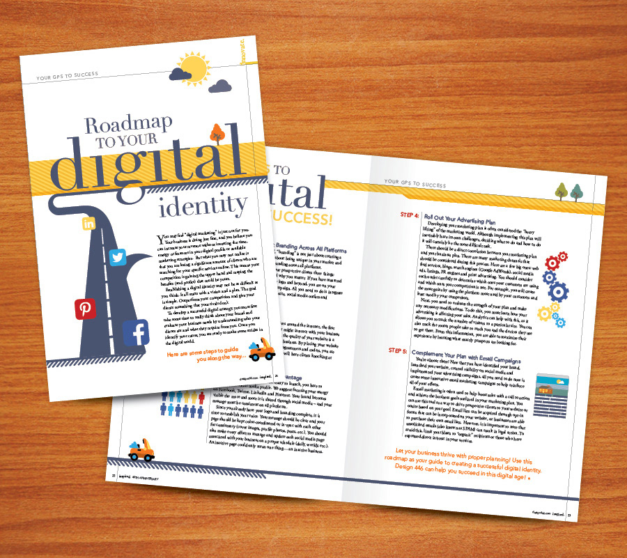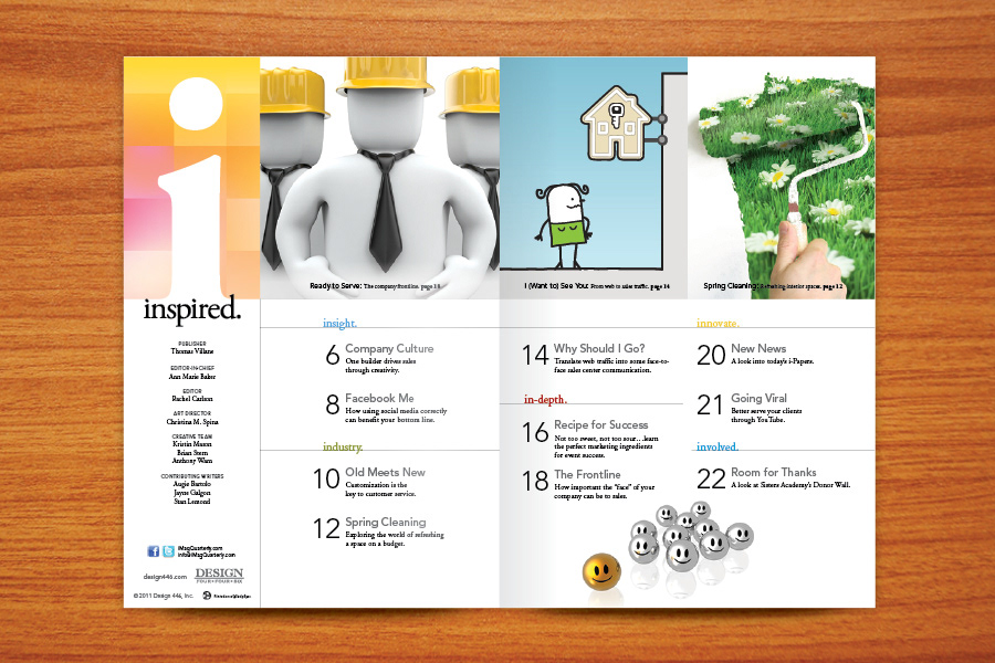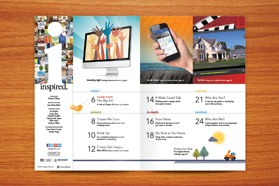 Originally concepted and designed by another designer at Design 446, inspired. was a 24-page magazine aimed at clients and marketing professionals, with each issue featuring recently completed projects and relevant interest stories. I took over as the magazine’s Art Director beginning with the fourth issue and oversaw a team of designers who were each assigned one or more spreads. With approved layouts in hand, I assembled the final magazine, wrote additional copy, proofread, and made adjustments along the way for overall style and consistency. In-house printing made it easy to press check and approve.